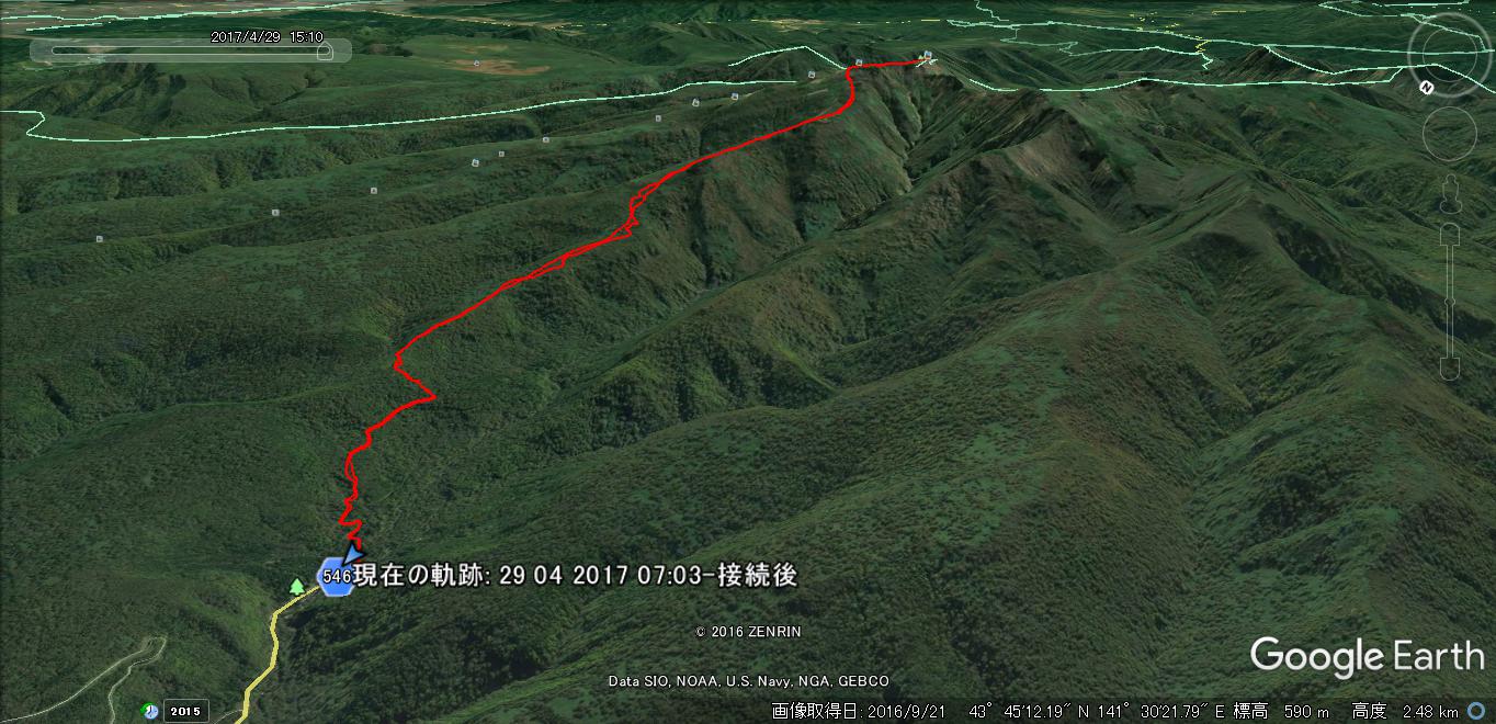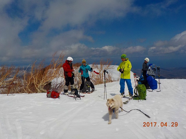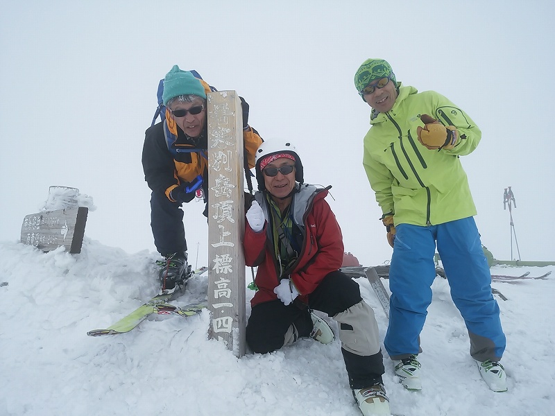 天気予報どおり、浜益あたりから雨が降り出す。暑寒荘駐車場に着いたときも小雨が降っていたため、小屋でちょっと様子見。15分程度小屋で休んだだけで雨も気にならない程度となり、7:10出発(計画書より10分遅れて出発)。出発後30分ですっかり雨もあがり青空が時々顔を出す。風も弱く、後続パーティーに次々と追い越されながらも。順調にゆっくりと進んでいく。頂上手前の大斜面上部はガスっていて見えない。○谷さんスキーデポして軽アイゼン、あと3人はスキーアイゼン装着して登る。急登上部からはほとんどホワイトアウト状態。途中、トレースが見えなくなり4人で地図・コンパス・GPS総動員し方向を確かめながら、またデポ旗10本全部使用してなんとか頂上に立つ(12:40)ことができた。記念撮影後、すぐに下山開始。3人はスキーアイゼン外しただけでシールを付けたまま下山開始である。大斜面からはシールを外して思いっきり滑ることができた。暑寒荘駐車場に帰ってきたところで、札幌のOさんパーティー4人が出迎えてくれた。 ★山スキー入門者・○飛さん、登り・滑りともまったく問題なし。特に滑りは上手である。 ★<もっと見る>に動画4本(スキー滑降)と追加写真&ログ(地形図&google earth)アップしています。 |