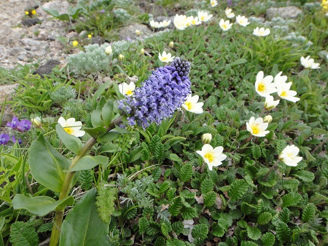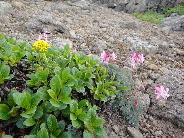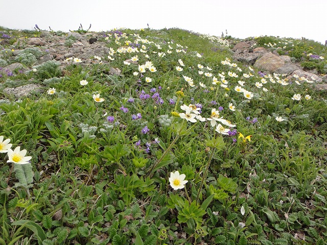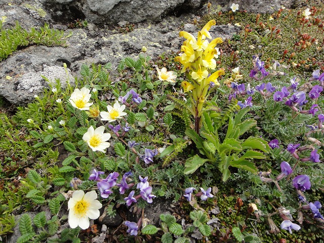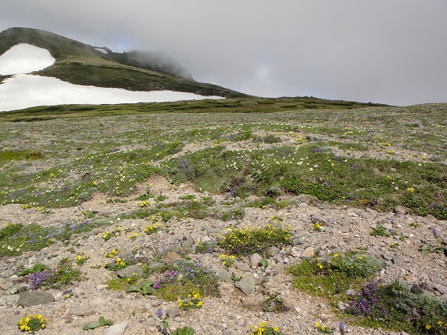 7月5日 赤岳から小泉岳、緑岳の途中まで行って帰って、白雲岳に登ってきました。 赤岳の雪渓はまだかなり残っていて、途中のお花は少しでしたが、コマクサ平は満開で、赤岳のコマクサ平を見直しました。 小泉岳から緑岳の間は花好きならよく知っているフラワーロードです。 チョウノスケ、キバナシオガマ、ホソバウルップ、エソオヤマノエンドウ、イワウメ満開です。 座って眺めると別の広がりがあって、大雪のすばらしさを感じます。 (残念なことに、大群落はうまくカメラに収まりませんが・・・)