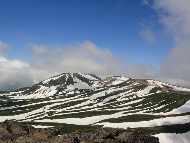 チョウノスケとホソバウルップのコラボ。 タカネスミレも満開でした。鮮やかな黄色の株が点、点と続いていてこんな風景はここだけでしょうね。 最後に白雲岳から旭岳方面の絵です。夏山入門のテンバはあの辺かなあ〜?と思いながら・・・ 早い時間に登ったので、人も少なくゆっくりお花を楽しめましたが、帰り時刻(白雲10時発)には既にたくさんの人、人となり、この時期の大雪の人気をあらためて感じさせられました。 降りてみたら駐車場は満杯でした。 | |
