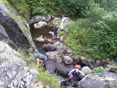 始めての長時間の沢登りでした。先頭を行く私は、途中、10mの滝で、高巻きするときは、登ったはいいものの、板状節理の上に乗った土と草で滑りやすく、しかもその先はトラバース気味で、にっちもさっちもいかずどうするか。やむなくゆっくりとクライムダウンしました。結局、中央のマユちゃんが、滝の正面からアタックし、事なきを得ました。ルートファインディングの大事さを知りました。長時間なだけでなく、連絡方法は?、下山するか、山頂を目指すかなど、自力で何が何でも下山しなければならない、けがしたときどうするかなど、危険をたくさんはらんでいるんだな〜と知った山行でしたが、沢登りの醍醐味を知ることができ、変化にとんだ沢登りでした。山頂直下での猛烈な根曲がり竹の超超藪漕ぎは時間が掛り大変でした。花の60代の皆様は(Lの中央マユちゃん、タフがいなM井さん、N野さんありがとうございました)体力があるだけでなく、安心感があります。私はまだまだだなーと思います。皆さんお疲れさまでした。そして、関係者の皆さんご心配をお掛けしました。後ほど動画をUPします。 | |