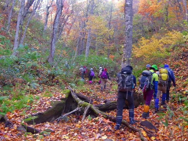 当初『神威岳(札幌)』の予定であったが、『定山渓天狗岳』(慰霊登山)に変更となった。会員12名&会員外1名、計13名での会山行となった。曇り、気温は低く肌寒い。紅葉真っ盛り、落ち葉が敷きしめられた登山道をゆっくりと歩く。事故現場付近にて献花・慰霊。高度が上がるにつれ特に風の影響を受け体が冷えてくる。防寒をしっかりとして頂上に上がる。下り、ロープ場では登ってくる登山者もあり思った以上に時間がかかった。 |