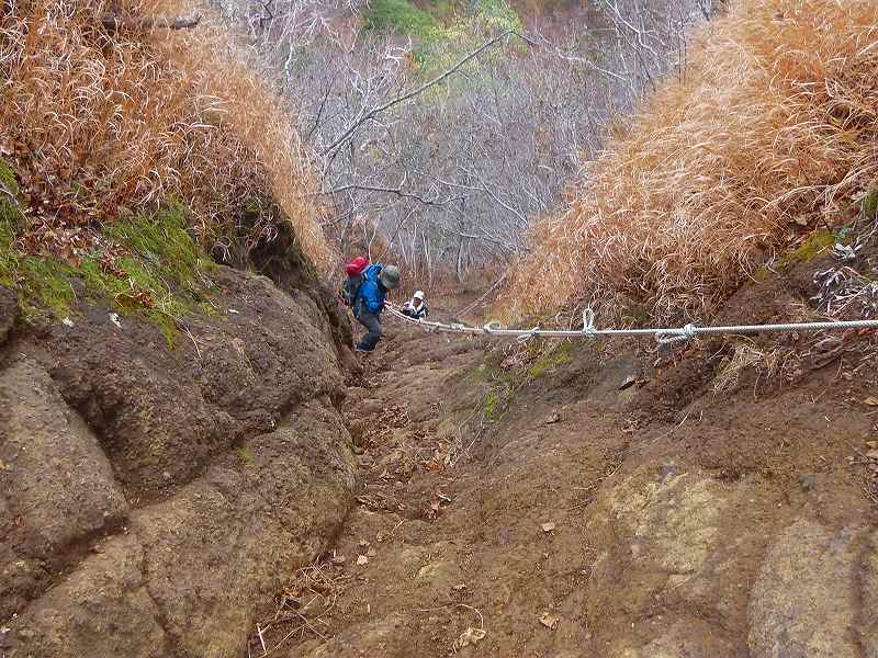 献花 | 落ち葉の登山道 | ロープ場(下山時) | ロープ場(下山時) | |