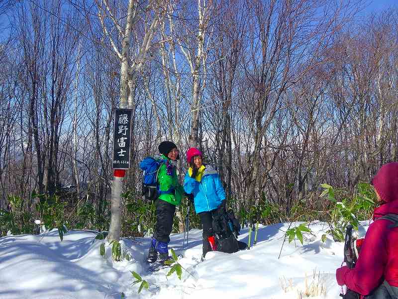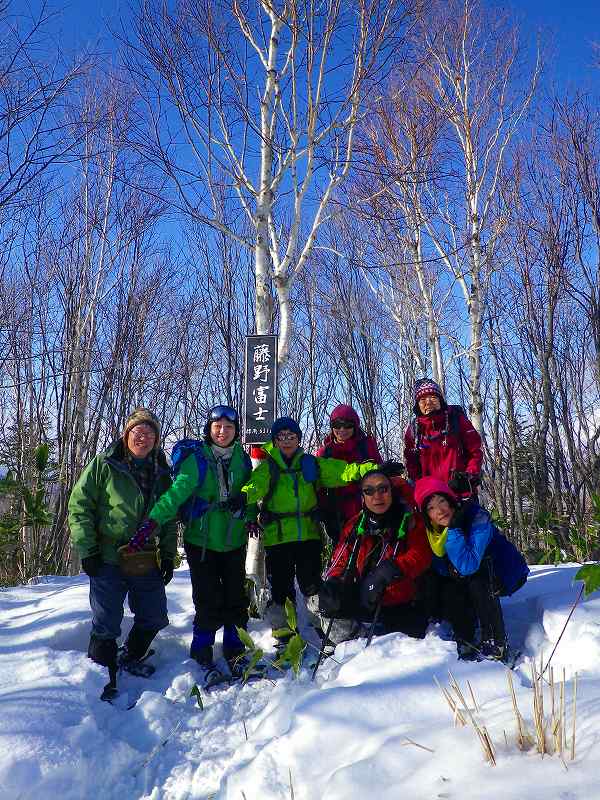 17日(日)雪山入門(入門者1名&スタッフ6名)で『藤野富士 651m』に登ってきました。晴天のもとスノーシューハイクを楽しんできました。頂上にてツェルト(2つ)を張って中でお湯を沸かすなど経験してもらいました。ビーコン捜索練習、ピットテストなども実施予定でしたが、ツェルトをたたんで下山準備するうちに寒くなりパスしてしまいました。ビーコン捜索練習、ピットテストなどは、疲れていない、登りの早い段階で実施しなければならないと痛感しました! 帰りは(GPSログ・地形図 緑線)は大きくショートカットし急斜面を下ってきました。 |