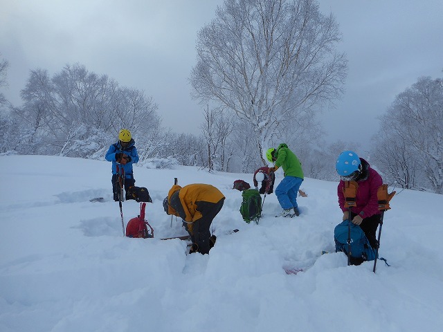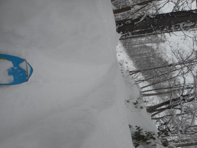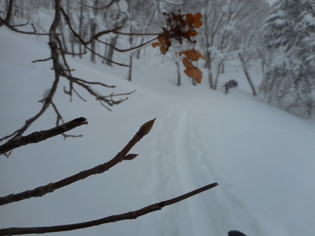 ビーコンチェック | 先行者がきれいに付けてくれました | ♪消えそうに 咲きそうな 蕾が〜♪ | 滑走準備 | |