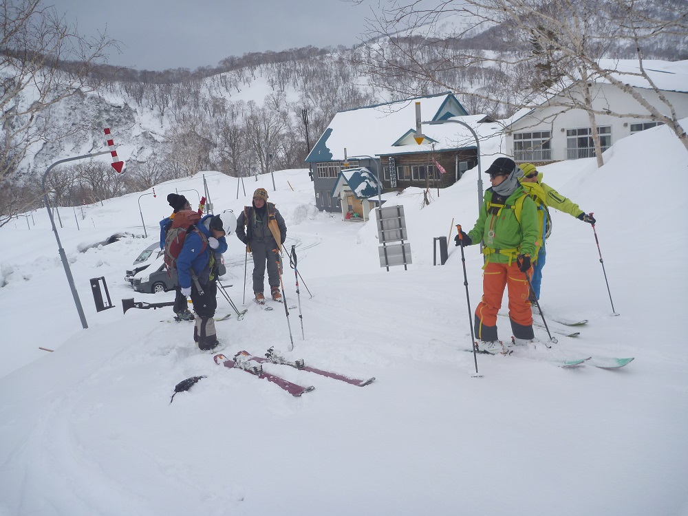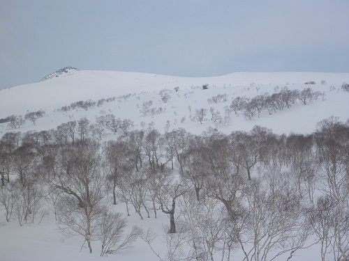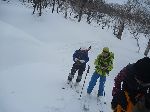 新人のHa嬢計画の目国内岳へ参加した。晴れ男のOさん・晴れ女と聞いたHa嬢 天候は曇り時々晴れ。メンバーはMさん・I飛さん・Oさん・Koさん・私の6名で情報館6時集合。リーダーは3日前に新見温泉(営業はしていない)からのスノーブリッジを偵察して大丈夫とのことです。終始Ha嬢の先行でなかなか良いコース取りだ。稜線ではかなりのガスで強風でしたが3時間位で山頂へ着いた。証拠写真撮影後楽しみな滑りだ、下からは続々登ってくる。雪は日差しで堅くなったところや重い雪で滑りにくい私は今日は調子が悪い(下手なだけ?)。滑りにはなかなか良い斜面だが苦労する。しっかりしたスノーブリッジを渡りシールを着けて登り返しシールを取り短いが自動運転で登山口に着いた、車は10台以上あり人気振りに驚く。帰路蘭越の温泉に入りさっぱりして帰った。リーダー有難う。 |