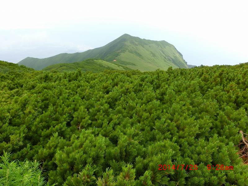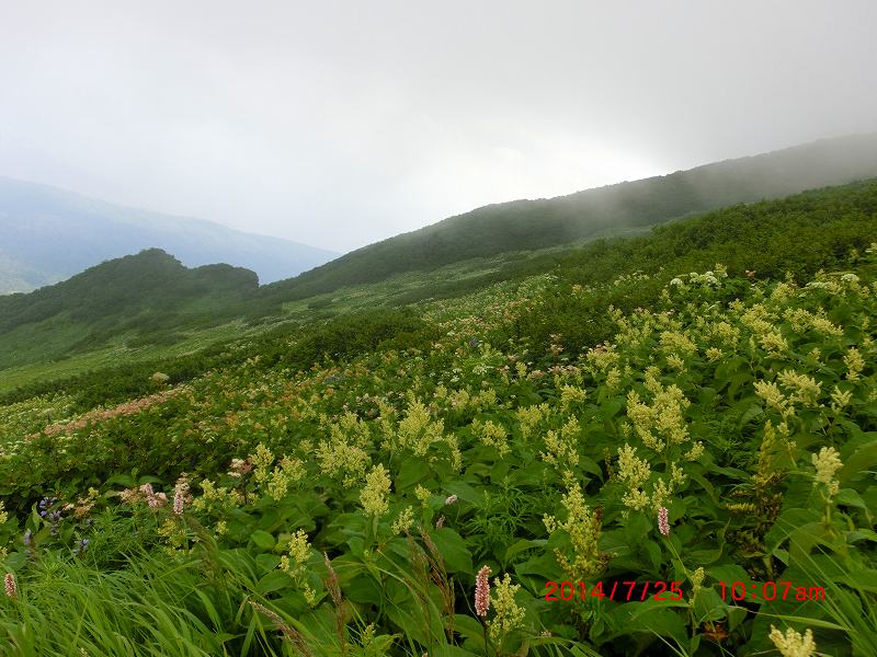 7/24〜7/26に念願だった利尻岳へ登った。さすが人気の百名山とあって10名ぐらいのツアーの団体や1〜5名ほどのグループの人たちが大勢いて山はとても賑やかで、小休憩の時などに情報交換し名刺頂いたりと、とても楽しく登ることができた。頂上での360度の眺望を期待して楽しみにしていたが、あいにく雲に隠れて見ることが出来なかった。残念! 風が弱かった事と雨が降らなかった分ヨシとする事にして納得。写真?長官山より利尻岳望む ?8合目長官山よりハイマツ帯の登山道。中央付近の建物は避難小屋 ?9合目辺りのお花畑 ?頂上にて コースタイム 登り5h 下り6h