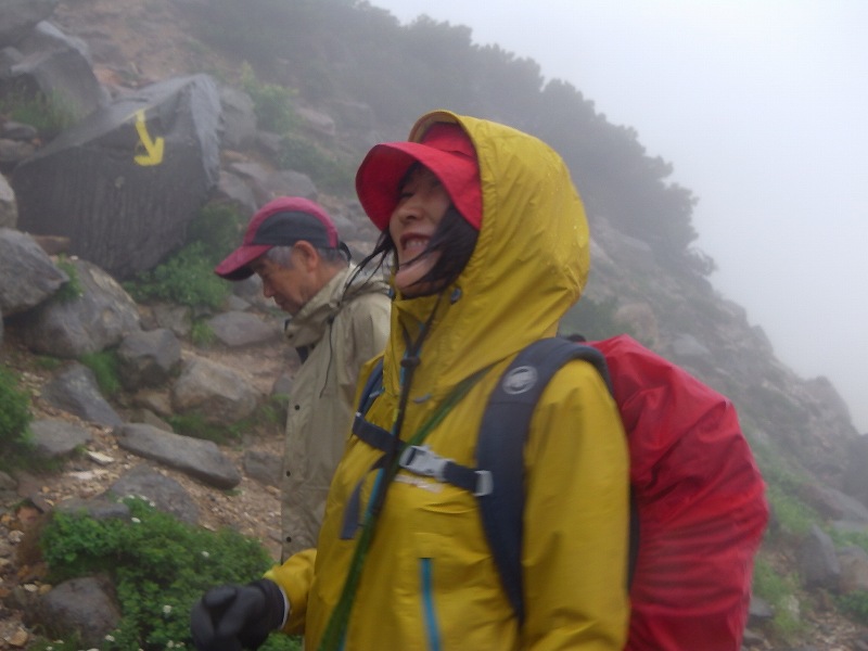22日、朝から小雨&ガス。「天気とくらす」で見るとC判定(おまけに強風予報)であるが、Bチーム(5人)せっかくここまで来たので行けるところまで行ってみようと決断するも天気回復せず、7:45 1510m付近で行動停止し撤退となりましたが、みんな楽しく登ってきました! 総行動時間2時間15分 |
