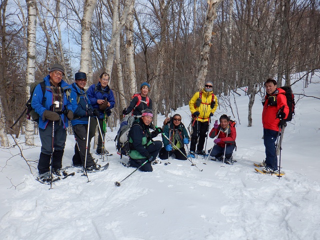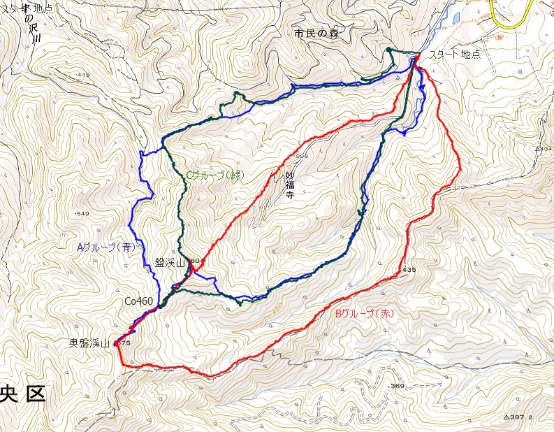 3グループが別々のコースでペースも異なることから、一か所に全員が揃うことは期待していなかったが、今回うまい具合に盤渓山と奥盤渓山の間のコル(460)で全員が勢揃いし、記念写真をとることができた。