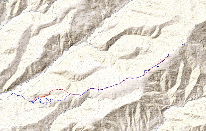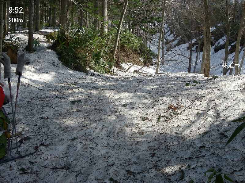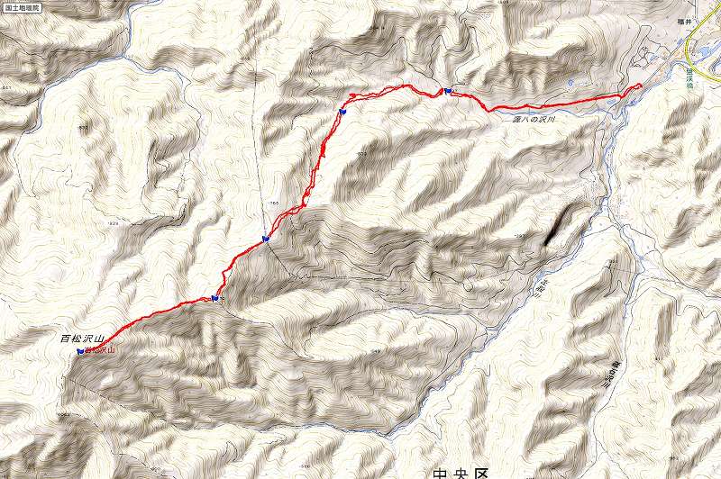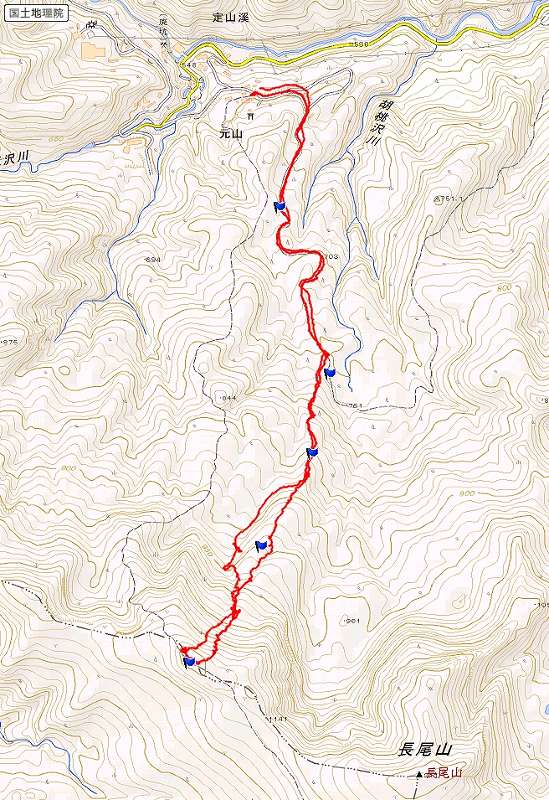 写真1−533mポコ(通称・大阪山)を過ぎた500mコルから撮影 写真2−GPSログ2(845m地点にて行動停止) 写真3−GPSログ1(林道歩き) 写真4−駐車地点 |