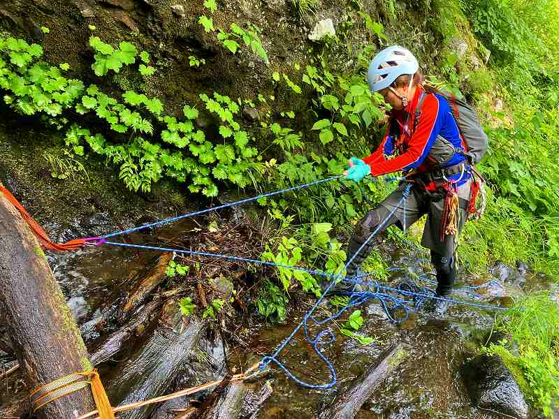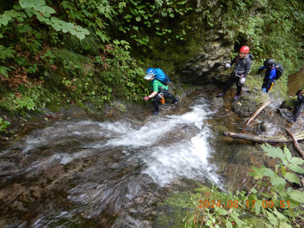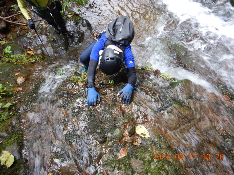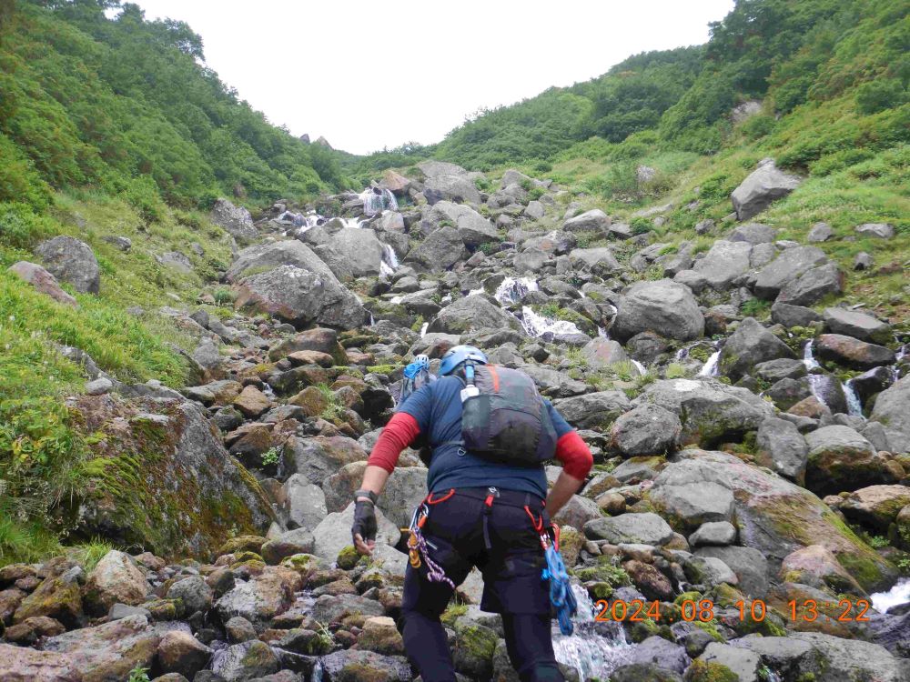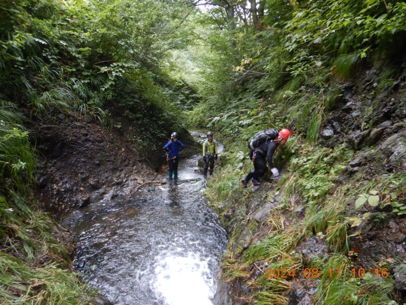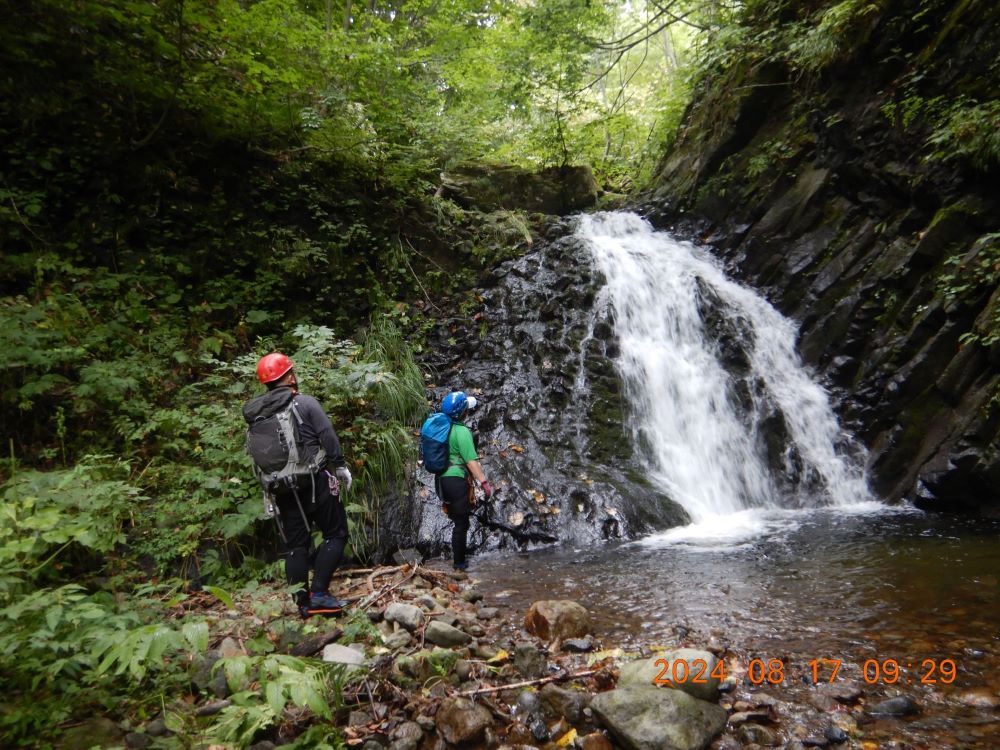 札幌市南区神居岳の木挽き沢に行ってきた。目的は会員の沢入門。最近、この沢に沿って登山道が整備され、いつでも脱渓でき便利。入門は、懸垂下降、ロープで確保されながらの小滝登り(無理やりロープを出した感あり)、へつりなども体験できた。へつりではドボンのオマケもついた。入門者二人は徐々に沢歩きに慣れ、思った以上に楽しんでいたうようだ。この沢、上部に登山道ができ、どうしても登山道にひっぱられ少々複雑になった。木挽き沢は下部の核心部がダム湖に沈み、一時は訪れる登山者が少なくなったが、渓相は比較的綺麗で、小滝も多く、初心者や自分のような高齢者が楽しく遊べる沢だと思う。