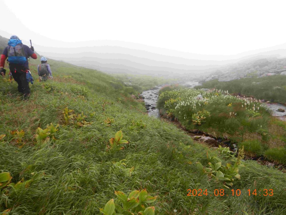白水沢から黒岳に登ってきた。白水沢沿い林道入口付近の国道駐車帯に車をデポしてスタート。林道はブッシュに覆われているが踏み跡がしっかりついていて快適。最終の砂防ダムを過ぎて入渓。お決まりの景色を楽しみながら遡行する。大滝を巻き、かなり疲れが出てきた頃に稜線近くの小さなハイマツ帯に着く、その後盛りを過ぎたお花畑経由で、黒岳石室へ。ここでは休まず最後の登りで黒岳、ここで大休止!登山道+リフト+ゴンドラで層雲峡温泉に予定時間を若干オーバーして辿り着く。ここも休まず車デポ地へ向かう。緩やかな下りと追い風に助けられ3q弱の国道歩きの後、本日の行動が終了!