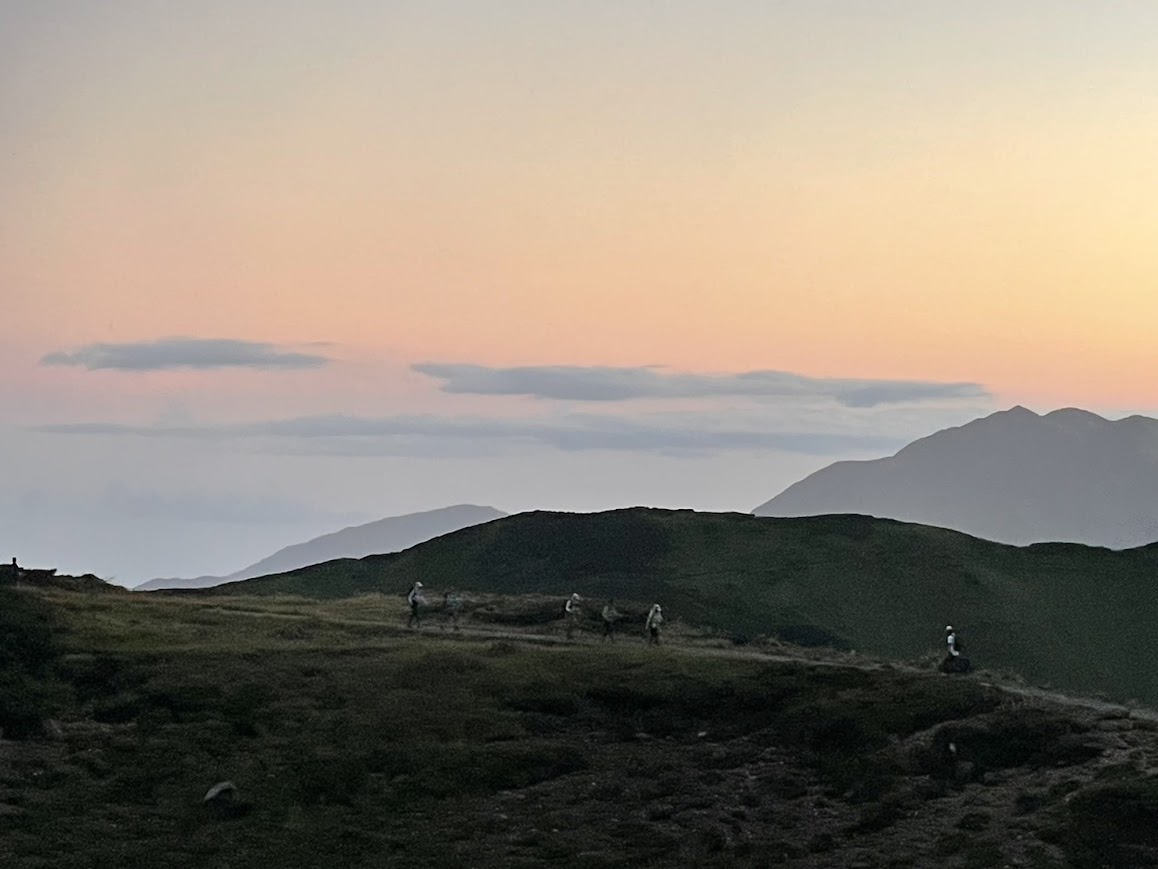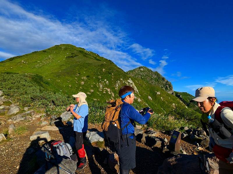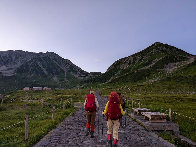 もう少し写真を載せます。みくりが池山荘で私の友人にばったり遭遇し、2日目出発の我々5人の写真を撮ってくれました。朝焼けの素敵な写真です。