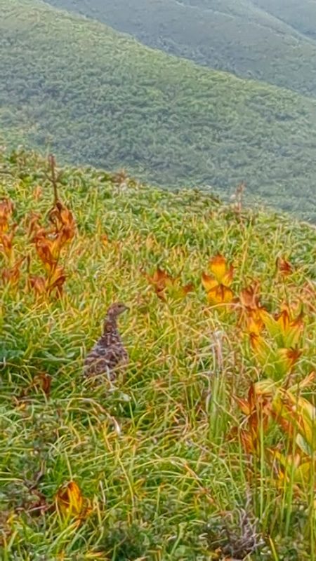 2日目の天気予報は良くなかったが、とりあえず新室堂乗越まで行ってみようという事で5時出発を目標に起床。温泉に何度か浸かり疲れが取れたのか皆の足取りは軽い。雷鳥沢ヒュッテくらいから青空が見え、虹もかかり皆の気分も高揚する。室堂乗越あたりで右手に剣岳がどっしりとした姿を見せ感動する。行く手には奥大日岳も雲一つなくすっきりと姿を現し青空の元気持ちの良い山行が続く。しかし、山の天気は変わりやすく7時頃よりガスが出始め、8:40奥大日岳に着いた頃はガスで眺望は良くなかった。下山途中で雷鳥の親子の声にYリーダーが気づき皆で写真撮影。何とか雨に当たることなく13:10みくりが池温泉に到着し2日間の山行を無事終えた。