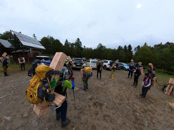 これでは4キロの登山はもたないと思い少し木材減らして32キロほどに収めて荷揚げすることにしました。それでも過去最高重量で登山することに・・・これを短縮登山口から4キロほど荷揚げしました。(;´Д`)