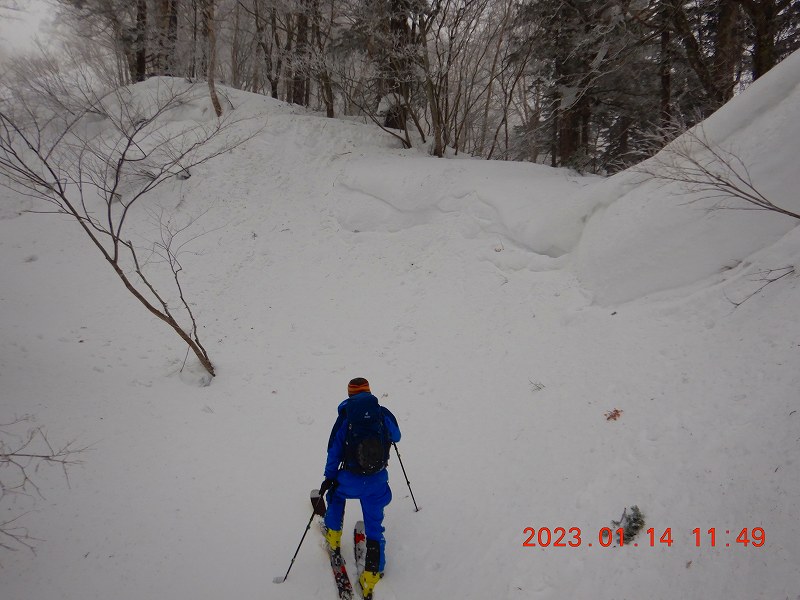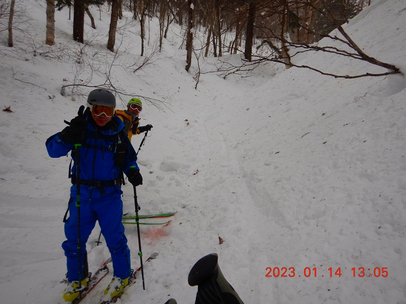 久しぶりの百松沢山 Sj 2023年1月16日(月) 10:16 久しぶりに百松沢山・宮城の沢コースに行ってきた。同行のMとShは初。本日午前中までの異常暖気のため、雪質はまるで春のザラメ移行前のよう、下りは最悪、M以外はスキー滑降に悪戦苦闘!登りでは、1本のトレースに引きずられ500m辺りから上部を予定外のルートでピークを目指すことになった。そのためか予定以上に時間がかかり南峰は行かず。メインのトレースと目印のテープを忠実に辿れば良かったのかもしれない・・なんちゃって。 357m分岐、それまで渡渉地点4か所。 予定外の尾根を目指す ピーク! ガリガリに雪質に悪戦苦闘、まるで4月