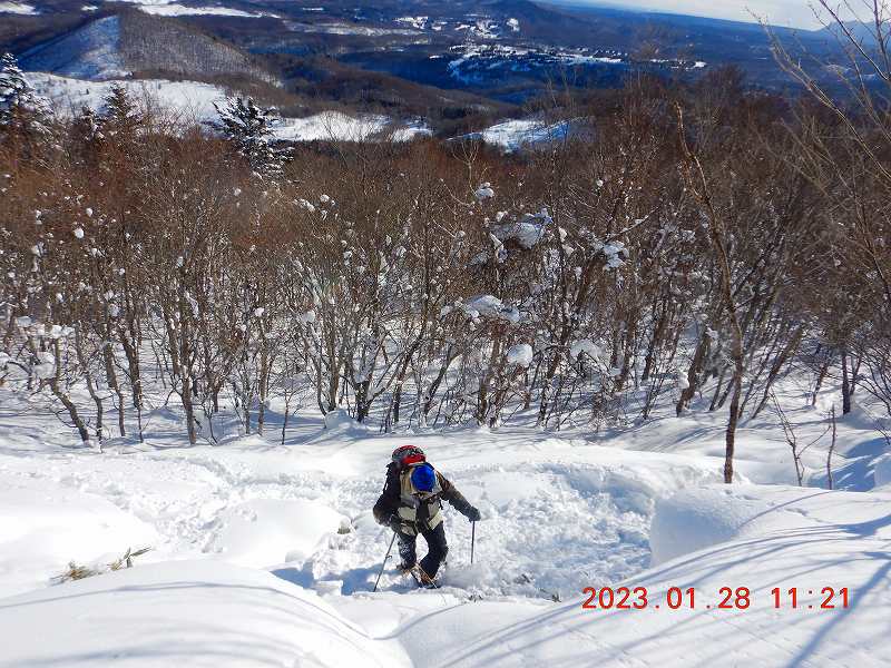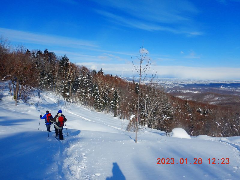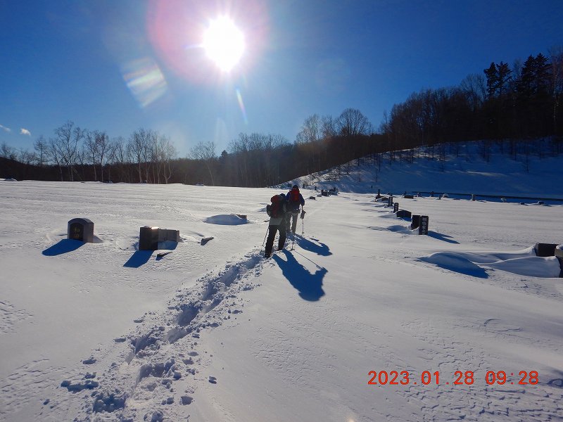 スノーシューでの雪山入門を南区藤野富士で行った。入門者は冬山が全く初めてのM。夏道とほぼ同じルートでトレースがついていたが、今回は入門山行なので途中からラッセルで直接ピークを目指す。急登にかなり苦戦していたMだが、徐々に動きが慣れてきた。コンパスの使い方、冬山でのルートのとり方などを学習しながらの行動となったので予定より時間がかかり、穴沢山へは行かず、藤野富士~常盤ヒルズで下山した。しかし、天気も良く、初めての冬山体験のMにとっては、恵まれた山行だった・・・と思う。