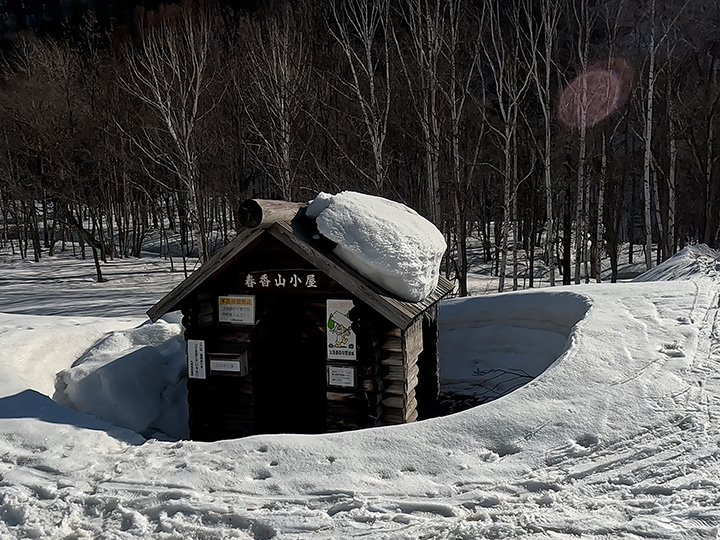 天候晴れ、風はなし、春香山小屋駐車場は3台車が停まっていた。真冬の春香山小屋の屋根に積もっている雪はいつもすごいが、だいぶ屋根の雪も溶けてなくなっていた。