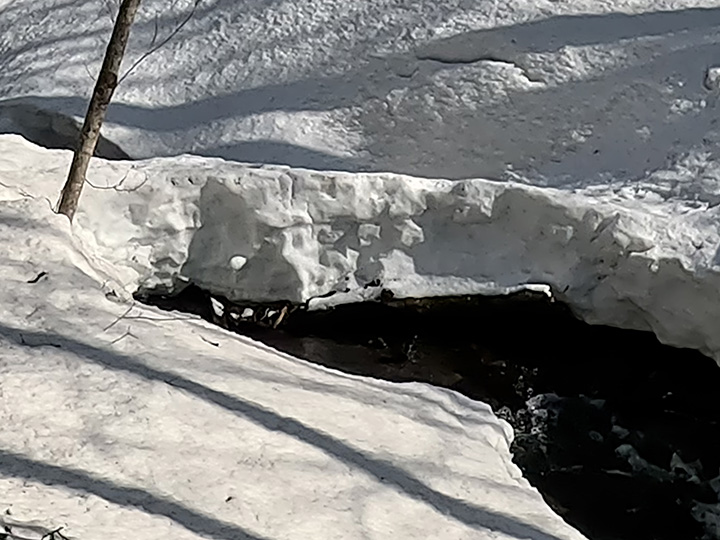 最後に林道に戻る際にスノーブリッジを渡るのだが、数か所渡れる箇所はある。