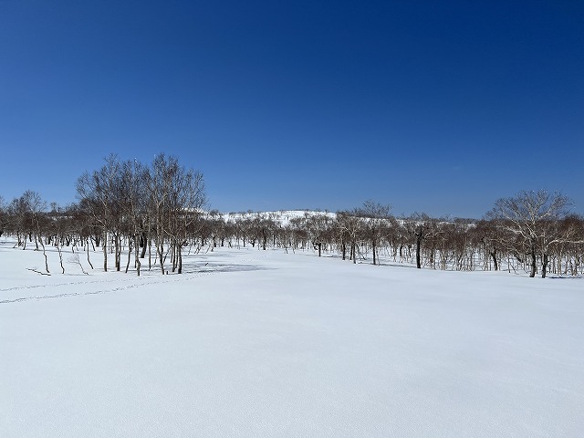 ちょっとした登りとまったり緩めの登りを繰り返し、最後は白い大平原の頂上台地をお日様を浴びながら歩く・・・春特有の幸せモード全開。