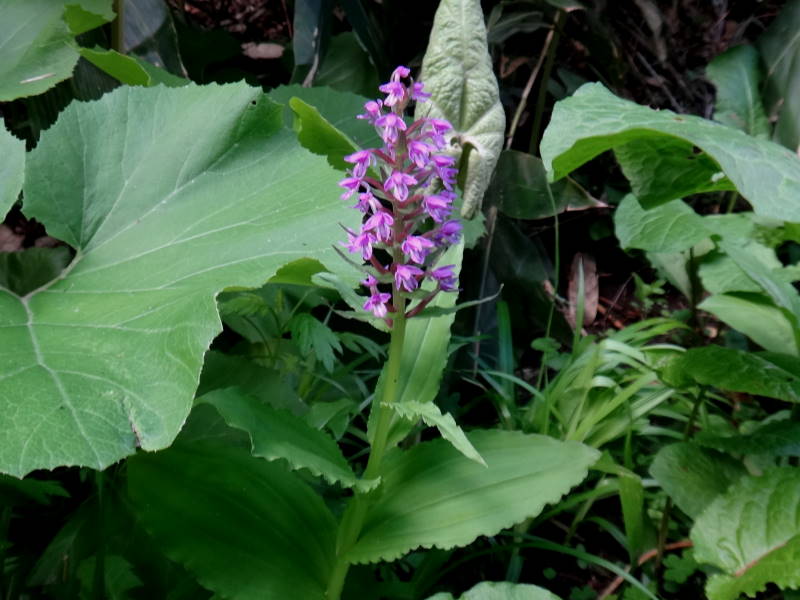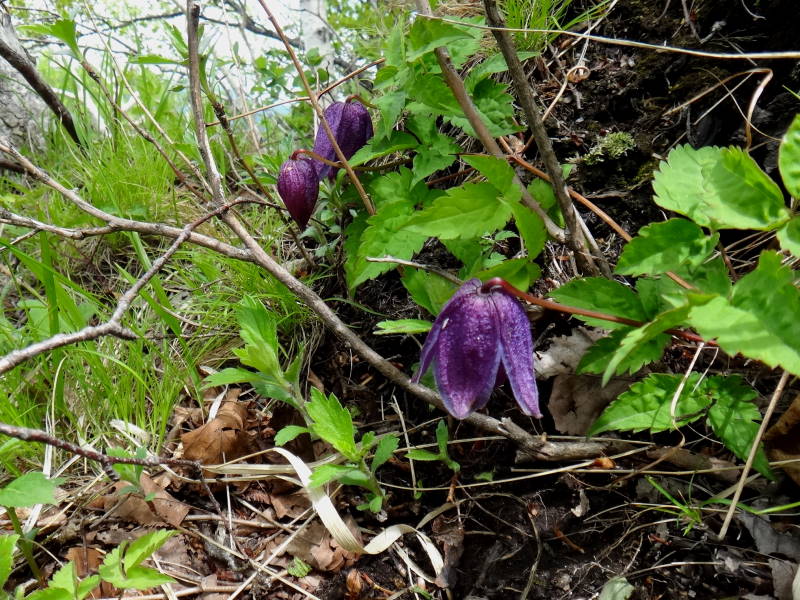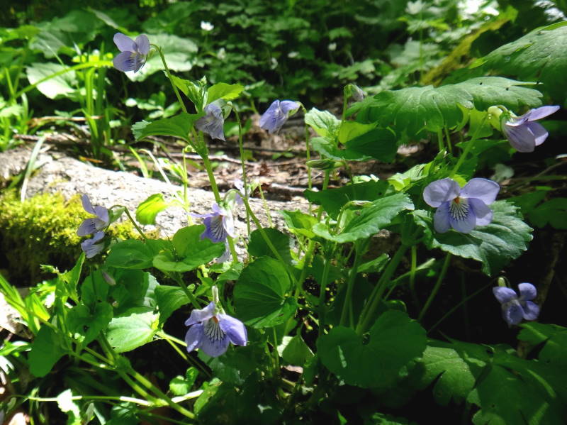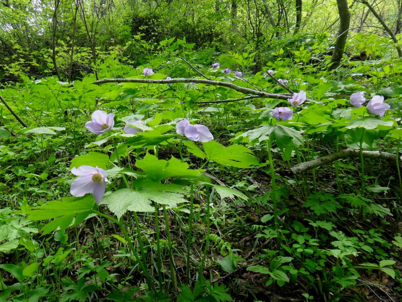 定天のスミレはほとんどがオオタチツボスミレと言って良いですね!スミレは難しいですが、ここのは地上茎があり、距は白く大型なので見分けは比較的簡単です。道内には他に距も紫で地上茎のあるタチツボスミレ、花も距も白く小形のツボスミレ(ニョイスミレ)更には一般的な地上茎が無く花も葉も土から出る距も紫のミヤマスミレがありますが、この4種類が圧倒的に多いそうです。後は荒○さんの好きなスミレサイシンを覚えておけば十分でしょう!シラネアオイも群落と言う程ではありませんが、かなりありますね!頂上近くにはJさんの好きな伏美岳とは比較になりませんが、ムラサキヤシオも数本あり春を感じます。ミヤマハンショウヅルも頂上近くには毎年咲いておりますね!