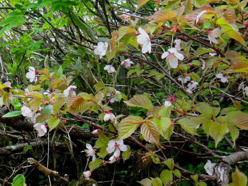 夕張岳で代表する花の一つはナンブイヌナズナ!相変わらず吹き通しに健在だがこれも心持少なくなったか?タカネグンバイはかなり数が増えた感じだ!ハクサンイチゲも咲き始めていたがこれは大雪には叶わない!雪が解けたばかりで未だにミネザクラが咲いている。しばらく振りのお花見だ!葉柄、花柄に毛がないのでチシマザクラではなくミネザクラのようだ。