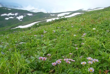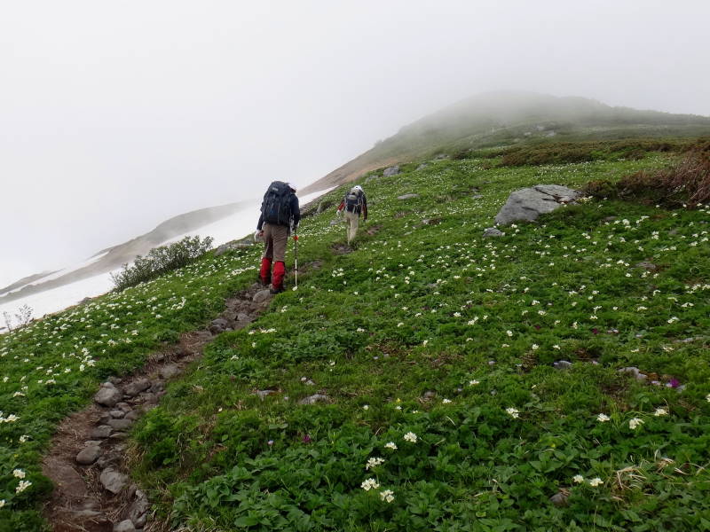 6/28箸別から4人、雨竜沼から5人の交差縦走!実に長く11時間~12時間を要した。雨竜湿原は花には少し早すぎたが、箸別側は7合目から9合目までは花の最も美しい季節でした。チシマフウロ、ハクサンイチゲ、マシケゲンゲ、ハクサンチドリ、ミヤマキンポウゲ、シナノキンバイ、ミヤマアズマギク、フギレオオバキスミレ、ハクサンボーフー、ヨツバシオガマなどが咲き乱れ、特にハクサンイチゲの群落は嘗ての大雪五色が原にも匹敵するものでした。