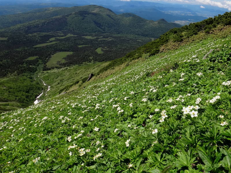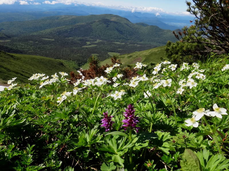 花が少ない!それでもエゾノツガザクラ咲くカミホロの小屋を出発!キバナシャクナゲが多く富良野岳ではハクサンイチゲが群落で見事だ!