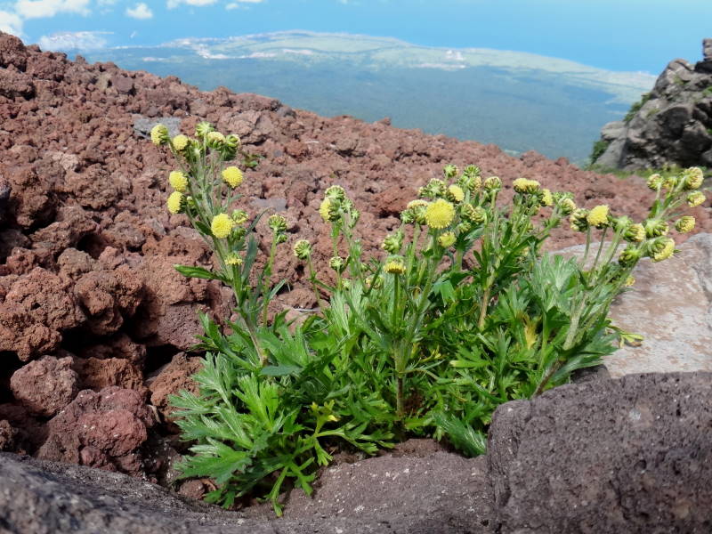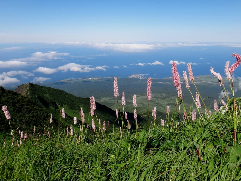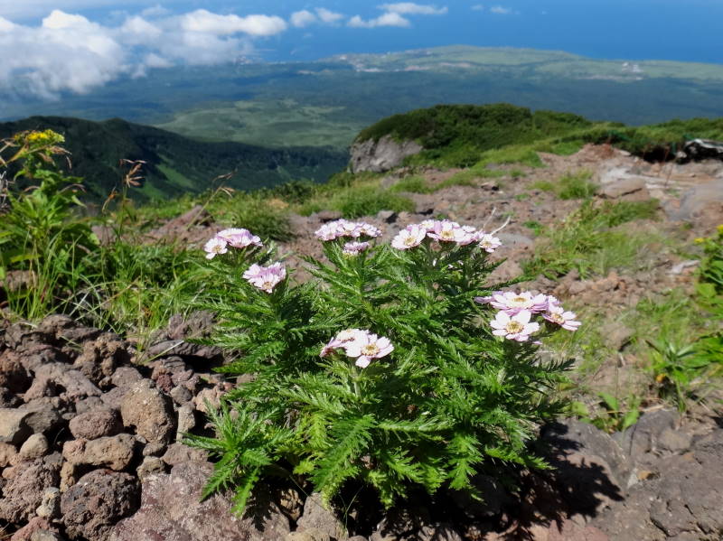 8/2絶好の天気の中、利尻山に行って来た。鴛泊港、礼文島を見ながら登山道を進む。8合目の長官山で初めて利尻山の雄姿が見える。この山はボタンキンバイ、リシリヒナゲシが特に有名だが今回は花期が既に過ぎたのか全く見られない。(6月末から7月初めが良いらしい。)しかしサマニヨモギ、シュムシュノコギリソウ(ノコギリソウ亜種)は多い!9合目付近で初めてシコタンハコベの大きな株に出会った!