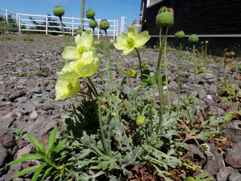 山には憧れのリシリヒナゲシはありませんでしたが、民家の軒下に咲いておりました。何でも種から育てたそうです。私がリシリヒナゲシを見たのは数年前の富良野岳9合目と山野草店だけでした。後は付けたしですが、イブキトラノオと鴛泊港を写して見ました。昨日あの海抜0mから標高差1719mを歩いてここまで来たのですね!それにしても長かった!それと再びシコタンハコベの写真も添付致しました。最後は利尻山の証拠写真でした。