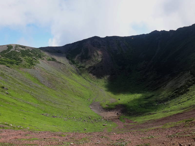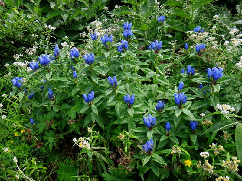 仙台労山所属の会友、飯○君を迎えて彼にとっては以外にも初めての事との事で昔の仕事仲間の3人で羊蹄山に行って来ました。8/1羊蹄山麓は大雨注意報。途中土砂降りで行き先変更も考えたがとり合えず決行!雨上がりのキャンプ場は晴れており、テントの外での宴会!8/2も天気不安定で午後から大雨予報!朝5時過ぎに出発。この時期は多くの花は既に散りかけている。コガネギク、ヤマハハコ、ハナニガナ、シロバナニガナ、ツマトリソウなどが主体だが、チシマフウロ、イワギキョウなどの残り花もわずかに咲いている。その中でエゾオヤマノリンドウがひときわ目立った!他にエゾニュウなどセリ科の雄大な花も咲いていた。新しく新築なった小屋は旧小屋と並んで立っていた。結局は2日共に大雨注意報の中、晴天で行って来ました。いったい誰のせいでしょう?