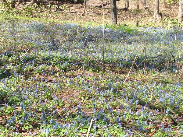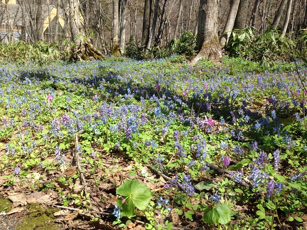 しかし、発見したのはエゾエンゴサクの大群落。登山口の看板手前あたりから何となく続いている散策路があり、足を踏み入れてみたら、あらら、びっくり!!これほどの群落は見たことがなかった。200M~300M位の散策路の両脇にびっしりで、まるで青い青い湖のようだった。ちょうど今が満開の見頃だと思う。こちんまりとした散策路だけれど、一見の価値はあります。