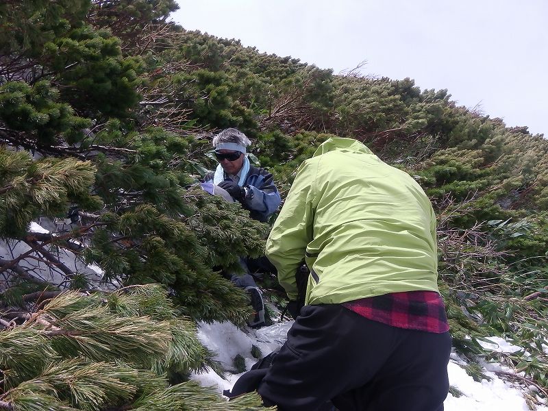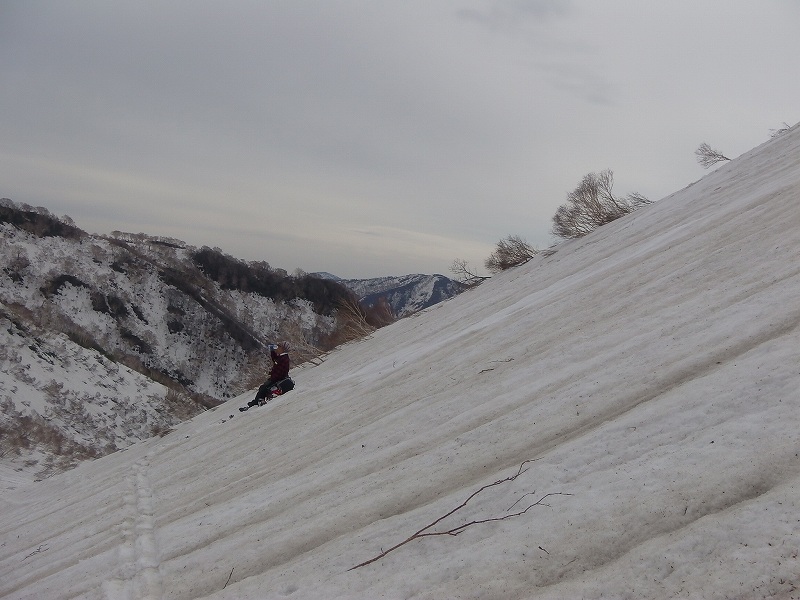 4年前から行きたいと考えていた狩場山を計画、メンバーはMさんとJ西さんの3人。毎年来ているという当日到着した2人組に様子を聞く。15日6:10スタートし所々舗装の出ている林道をスキーを付けたり抱えたりして歩いた。7:15林道離れしばらく林のうるさいところを進み、歩きやすい千走川右股川右岸沿いに。沢は結構開いているため沢沿いに進むも長い急登になりかなり難儀をする(かなり時間がかかる)。どうにも登れず9:15急な沢に降りて休憩。スキーアイゼンを付け(J西さんは付けないで)そこからは広大なボール状の急登だ、朝会った2人が降りてきた上手だった。どうにか滑落の恐れはない斜面をジグを切って延々と登る。強風が吹きすさぶ稜線着12:40(1475m)登り6時間30分。山頂はすぐだがここで行動停止。稜線の景色を楽しみ下山開始13:15。いよいよ滑りだ、他には無かった急で長い長い大ボール斜面を思い思いに滑る。下の方は少し木々が煩いがやっと14:00林道に出る。そこからスキーを付けたり抱えたり(Mさんは往復ともシートラで)汗をかいて50分で車に着く14:50。千走川温泉に入り帰路に着いた。16時発 19時新発寒着。