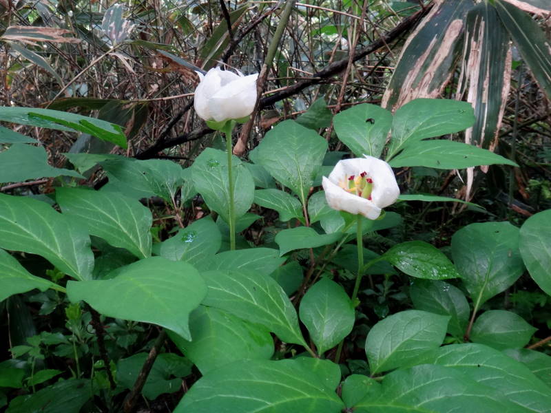 美唄山の山開きが前日の雨の為、登山道の状態が悪く中止になり馬追山に転身!数十年振りのヤマシャクヤクを見つけ感激!我が家の庭にも山野草店から購入したものがありますが、自然界のものはかなり久し振りでした!花が終わったもの、つぼみのもの、終わりかけたものを含めて4株ほど見つけました!うっそうとした日陰の登山道はラン科のものが4種類!サルメンエビネ、コケイラン。それにノビネチドリとギンランを確認。その他にはオオアマドコロ、オオハナウド、クルマバソウ、ツクバネソウ、クルマバツクバネソウ、コンロンソウ、マイヅルソウなど一般的な花が咲いておりました。