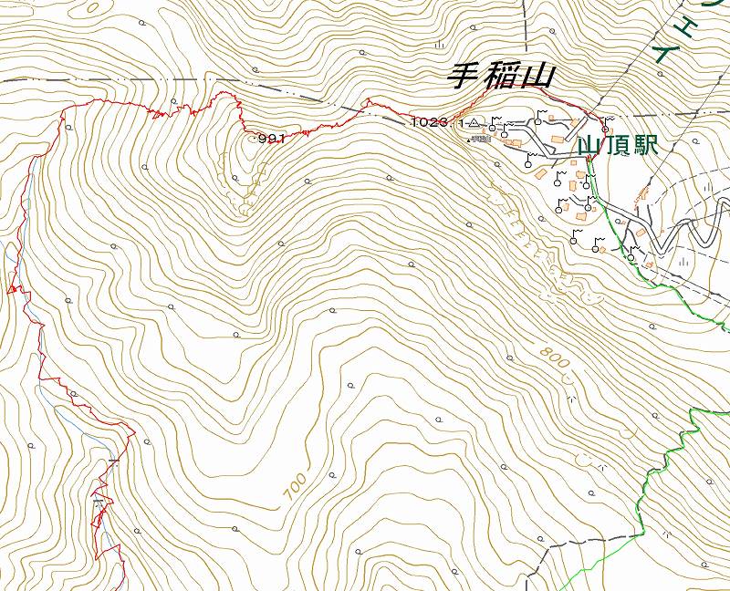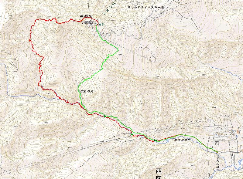 06:30小雨のなか平和の滝駐車場を出発。早目の入渓(320m付近・予定では440m)をして、660m大滝(10m)までの予定をこれまた500m二股で「右股をちょっと登ってみる」として右股へ変更した。このあたりから雨は止んでいたので「滝(地図上の滝マーク)」まで行って見ることにする。右股沢はいわゆる「ブタ沢」であった。そうこうしているうちに、じゃあこのまま右股沢を詰めて稜線上に登り、そのまま「手稲山頂上(付近)」まで行き、平和の滝夏道を下ろうということになりました。しかし、いざ登ってみると右股源頭を過ぎてからのやぶ漕ぎ&稜線に上ってからのやぶ漕ぎも強烈で夏道に合流(頂上付近)したのが14:35となりました。