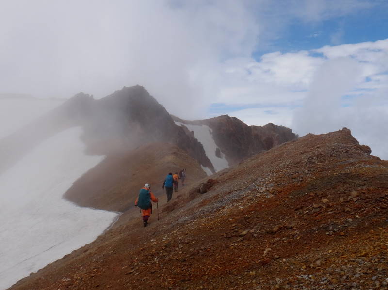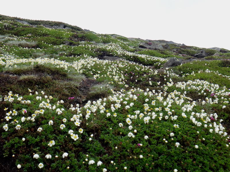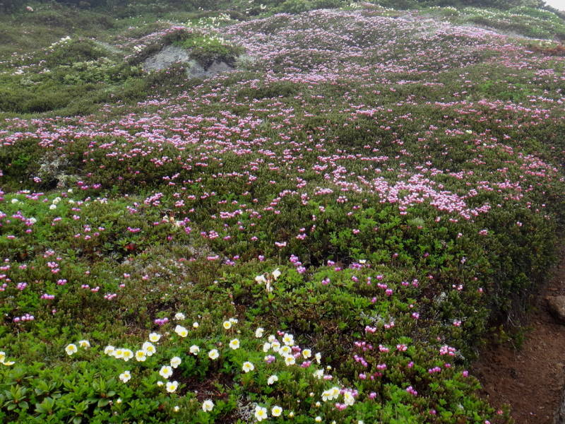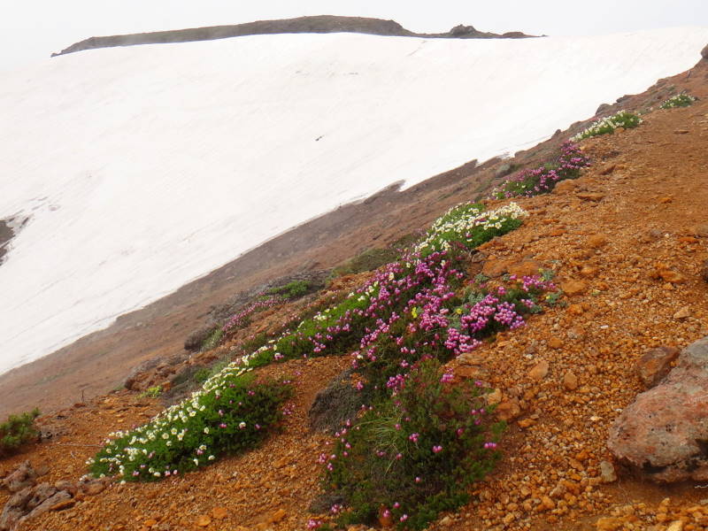 雲の平はイワブクロが相変わらず元気です。北海岳の近くには毎年アルビノ種の大きな株がありますが今年は訪れる事が出来ませんでした。北鎮を過ぎ比布岳付近は雪渓が多く残っておりますが、チングルマやエゾノツガザクラが綺麗でした。