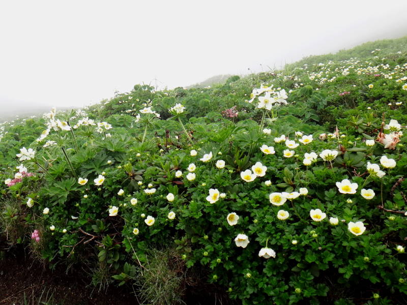 安足間を過ぎるとエゾノツガザクラ群落がすごい所がありました。大雪山にはあちこちにもありますがこちら方面では初めて見ました。又、チングルマの群落もありましたが、その中にちょっとだけ背が高いのがありますがハクサンイチゲです。メアカンキンバイとエゾノツガザクラの対比も絵になり良いアングルかなあ?と思い写して見ました。その近くにはミヤマタネツケバナも一株ありました。