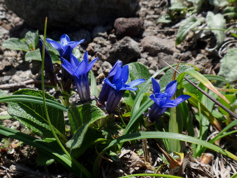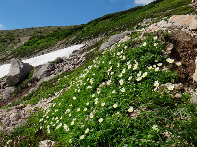 何時もの定宿、層雲峡のガレージホテルが閉鎖されており一瞬ガーン!やむなく2階?の駐車場にテントを張る。フライを持ってきていなかったので雨が降ったら大変だった。翌日は6時に銀泉台を出発。今年は雪渓が多い!地上は今年最高の猛暑、しかしやはり大雪は違う!心地よい雪渓歩き。花も春の花も多い!チングルマ群落もあり感激!リンドウはミヤマリンドウがやはり多いのだが、白雲分岐の近くには数株のチシマリンドウもありました。イワギキョウのアルビノ種、イワブクロのアルビノ種モドキもありました。白雲岳山頂は初登頂が二人、4度目の挑戦で初めて晴れた方が一人(これまではガスで何も見えなかったそうです。)と360度のパノラマを満喫致しました。ゆっくり歩き、たっぷり休憩をとっての8時間半の山旅でした!