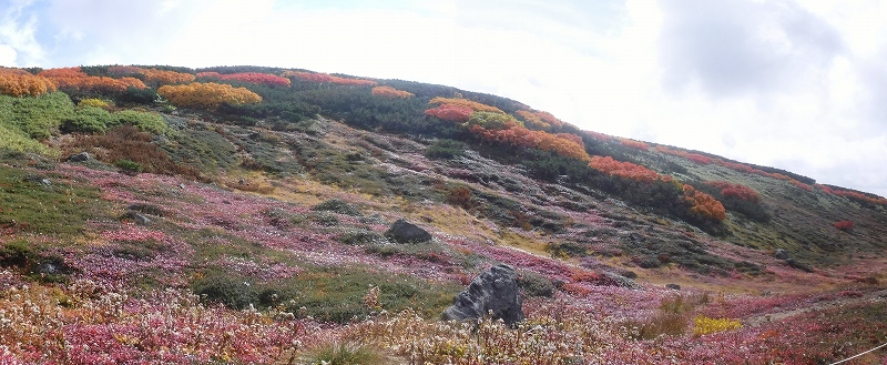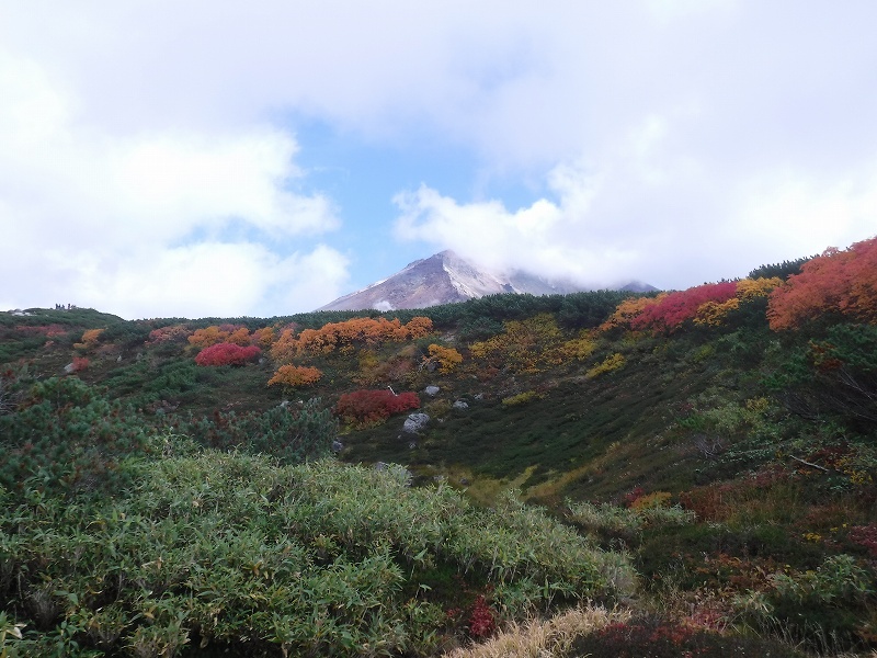 山頂付近は強風とガスで残念でしたが、姿見駅からの紅葉は見事でした。タカネナナカマドの赤と足元の赤はチングルマです。