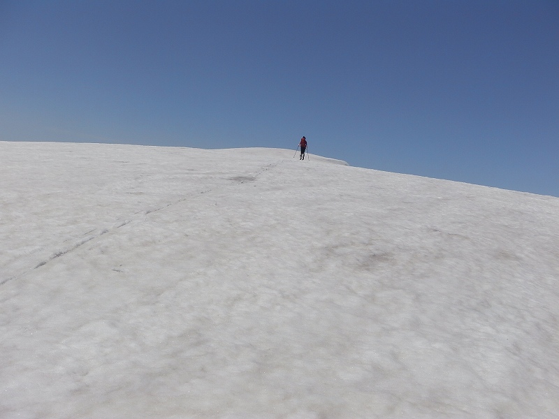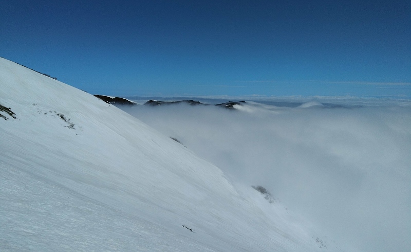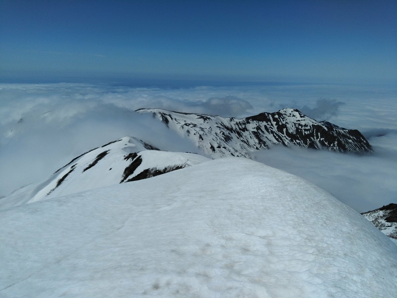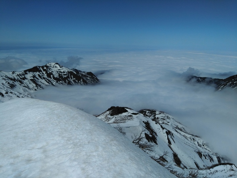 11日(木)道の駅「よってけ!島牧」駐車場にてテント泊。(島牧村役場の許可もらいました。)12日(金)3:50起床、食事済ませてテント撤収し5:15出発。駐車地点(キャンプ場手前1.5km付近)5:55出発、何度かスキー担ぐがなんとか雪を繋いで尾根取り付き地点へ。尾根急斜面取り付き地点(700m)からスキーアイゼン装着する。1400mくらいから上部は素晴らしい青空、下は雲海が広がる。頂上着(藤○さん12:00、M 12:05、安○さん12:15)。風は6~8m程度か?真っ青な空、稜線が雲海のなかに消えていく。下りは急斜面の沢を一気に滑り降りる。980mあたりから沢開いていたらやっかいと思い、トラバースぎみに右に巻いていく。これが曲者であった。910m付近で亀裂(クラック)に囲まれていまい、亀裂からの脱出(880m)に難儀する。30~40分かかったように思う。14:08やっと林道と合流する。15:30駐車地点着。 総行動時間9時間35分 <もっと見る>にスキー滑降の動画2本アップしました。