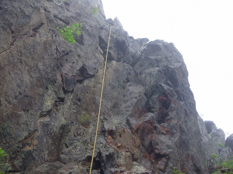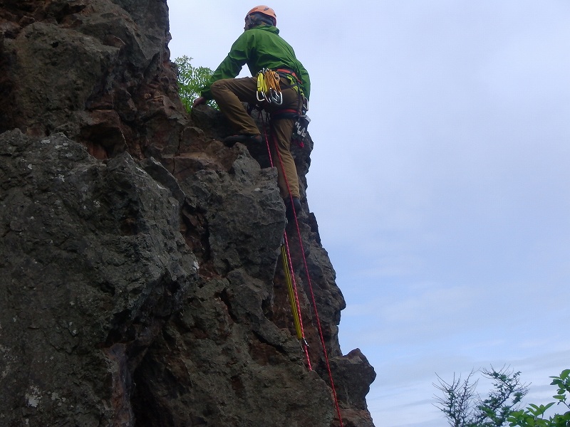 時々小雨が降るなか、なんとか『岩入門』完了~ 最初、「奥リス」に向かうがすでに他山岳会に場所を確保されていてダメで、次に「東のチムニー岩」に向かうも、ここも他山岳会に先に確保されていたため「四段テラス」にて入門開始。西面にて懸垂下降の練習&東面「ノーマルルート3級18m」にてクライミング。雨が本格的に降り出したため午前中で中止となったが、基本的な入門プログラムは実施できました。