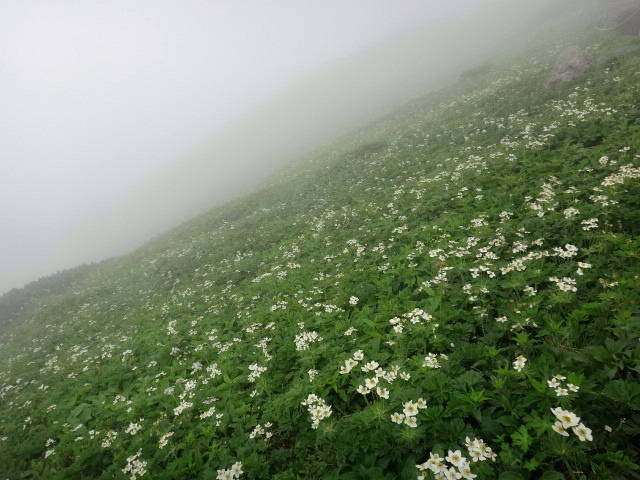 富良野岳の花たち 札幌のO 2017年7月18日(火) 6:36 生憎の天気で夕張岳から富良野岳へ転進。昼からは土砂降りに会いましたが何とか富良野岳に行って参りました。ガスの中のハクサンイチゲ群落、チシマノキンバイソウ、エゾルリソウ、トカチフウロ、チングルマ、コイワカガミ、イワヒゲ、ミヤマオグルマ、コマクサ、ホソバミゾホウズキ、オガラバナ等が咲いておりました。 ハクサンイチゲ群落 チシマノキンバイソウ エゾルリソウ トカチフウロ&チシマノキンバイソウ