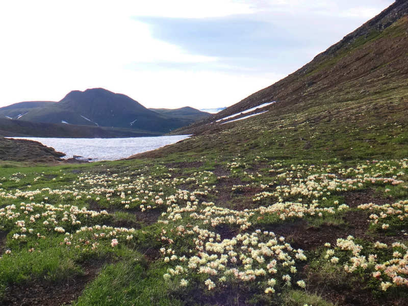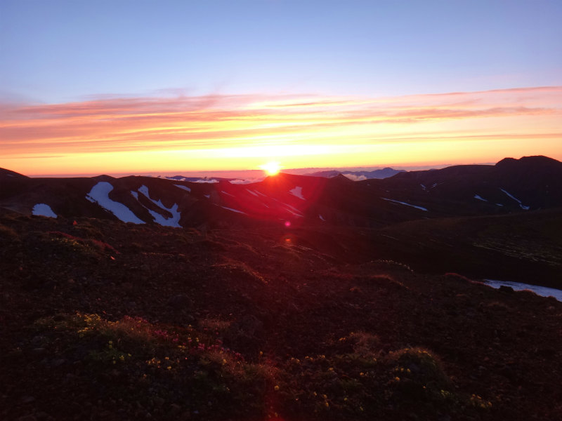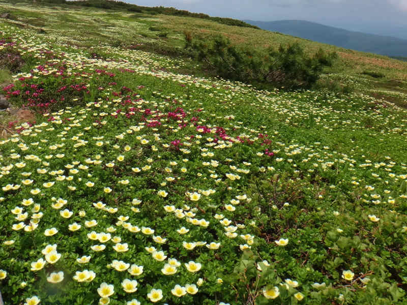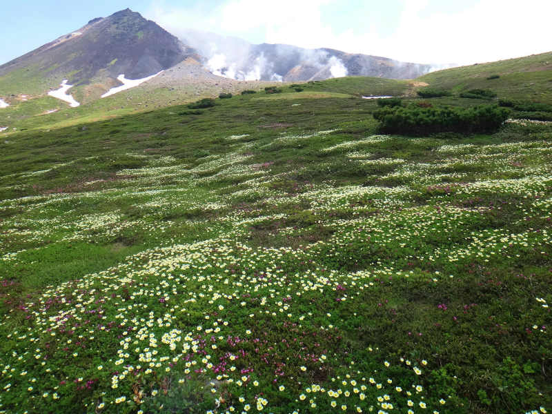 7/5より7/6まで表大雪は裏旭のテンバに泊まり花を見てきました。テンバはキバナシャクナゲの群生地にあり、大雪渓で冷やした缶ビールを堪能致しました。朝は裏旭岳に上りご来光を楽しみました。写真はテンバのキバナとご来光。更に有毒温泉と咲き始めたヨツバシオガマ。裾合平のチングルマの群落には少し早すぎましたが、姿見近くでチングルマの群落を見る事が出来ました。