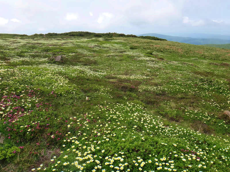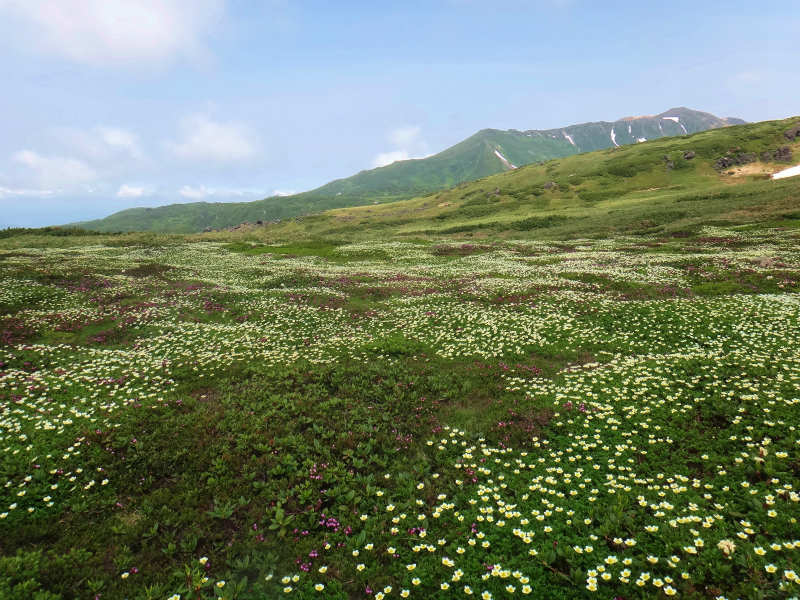 大雪の花をもう少し添付致します。大雪はメアカンキンバイのほうがミヤマキンバイよりは多いようです。裾合平はむしろミヤマキンバイのほうが多かったようです。イワウメは白雲のほうが多い感じではありますがまずまずは咲いておりました。又チシマクモマグサもクモマユキノシタも咲き始めておりましたがクモマグサの写真を添付致しました。最後はエゾイワツメクサでした。
