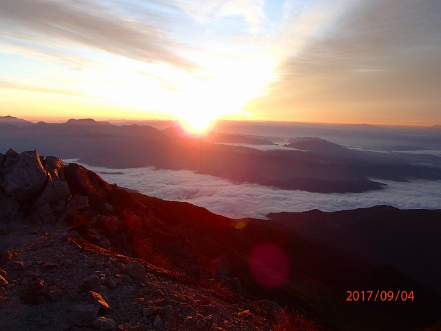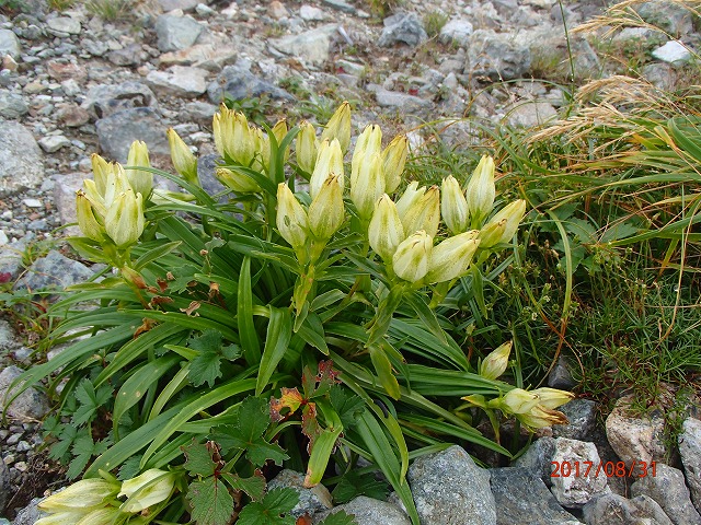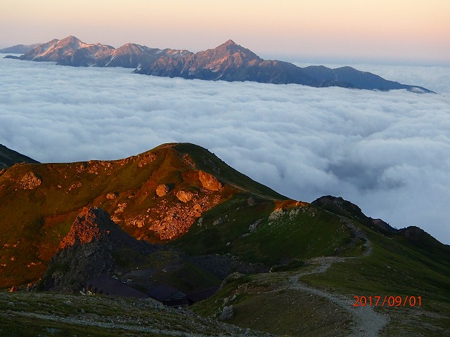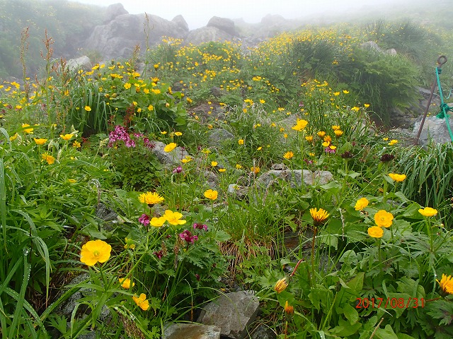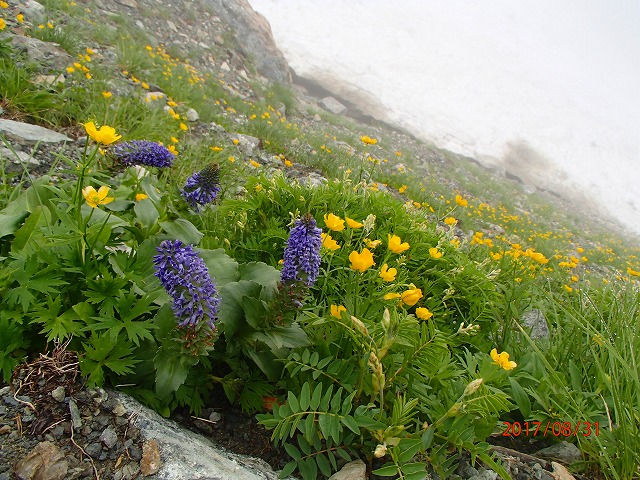 8/31曇、猿倉から硬く凍った大雪渓を過ぎると次々と花が出迎えてくれました。ハクサンジャジン、トウヤクリンドウ、ウルップソウとミヤマキンポウゲかしら。翌日快晴、360度見渡せます。雲海と山々、すぐ南西に剱岳、遠くに富士山、槍岳と穂高。雲が山の上を流れています。
