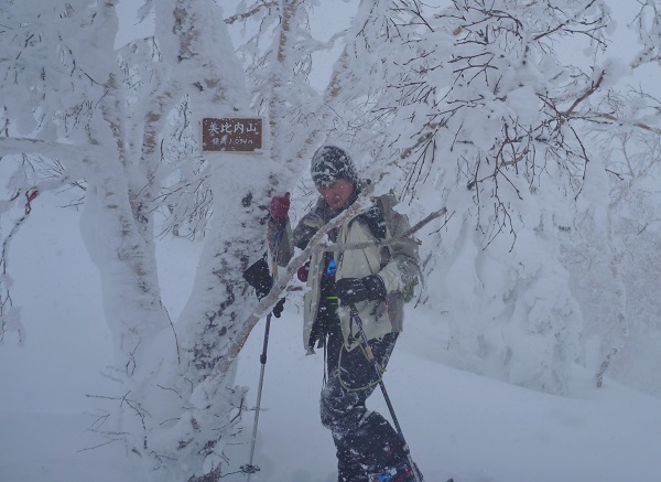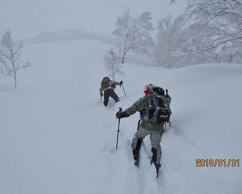31日L M田 Hさんと3人で美比内山へ行った。短時間で登れる山と思って参加したが、けっこうきつかった(終始ラッセルしてくれた2人にとっては、私は高齢?と楽をさせてもらった)。登山口ではやや吹雪いておりラッセルは脛くらい他に車はない。コースは右大江沢沿いに進み北側の尾根に取り付いた。吹雪で山頂が見えない中2人はGPSを使う。最後の急登の膝上ラッセルでは特に時間がかかり雪庇の隙間から吹雪の山頂へ。風もあり早々シールを取り下山する。急登でも雪が深く早くは滑らない、その後は緩すぎてほとんどがストックで漕ぐ。最後の尾根から右大江沢への下りが良かった。疲れたが?久々の山行楽しかった。登り4h、下り1.5h。