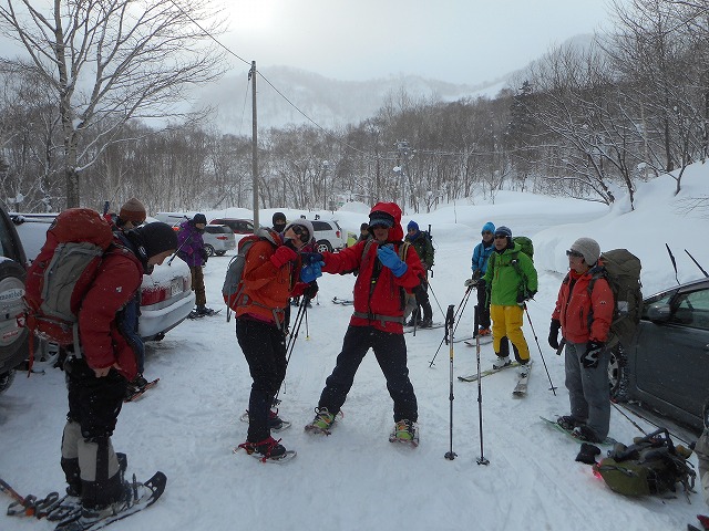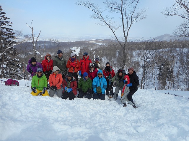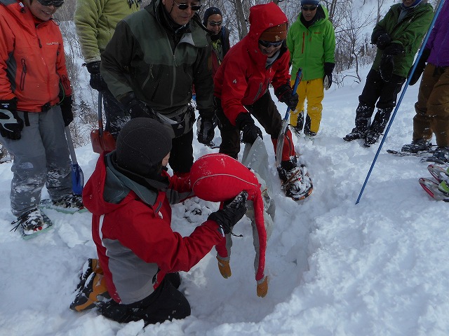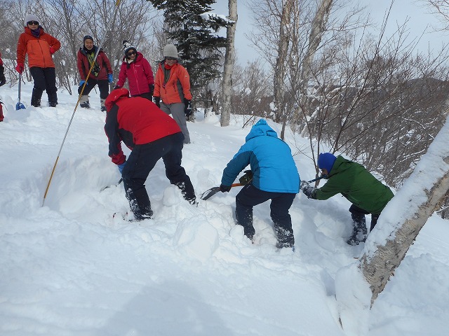 終日、主に雪崩に対するスキルを身に着けるため、雪崩れのプロMさんによる講習会が行われました。約1㎞程度歩き汗を掻きました。途中の尾根取付斜面では、雪崩れ地形やその時の行動回避を学習。さらに進み、急斜面においてCT(シャベルコンプレッションテスト)やECT(拡大角柱テスト)によるリスクマネジメントを学びました。尾根上においては、プロービングやシャベリングを習熟しました。休憩をはさみ午後から、ビーコンによる捜索方法を実施しました。実際に人とみなした人形(深雪ちゃん)を使用して、エアポートアプローチを学び下山しました。14名の皆さんお疲れさまでした。