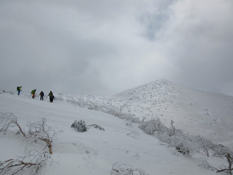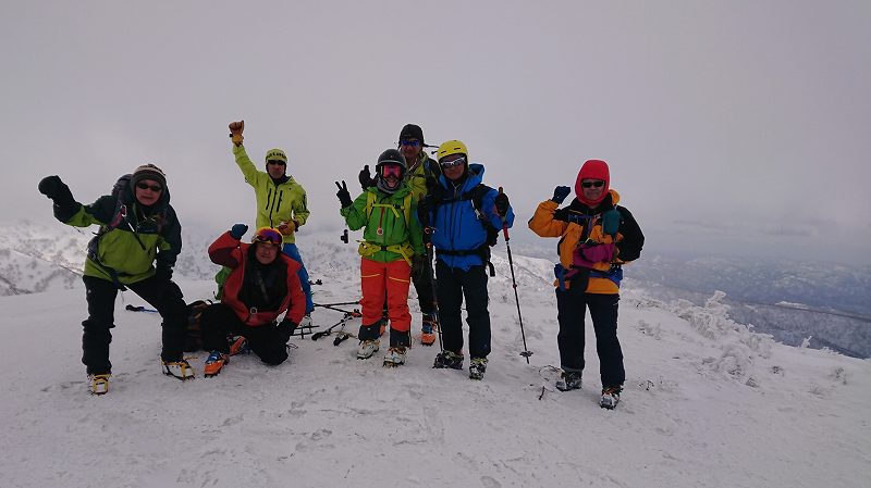 朝、3時半に自宅を出発し林道を6:00出発。おまけにアイゼンは有に1キロは在るし、5時間半のhikeを想定しているので、水は1リットル、それに非常食、3種の神器等、BCで生まれてはじめての10キロ以上のバックパックを背負っての山スキーでした。自分の身体ごと飛ばされそうな勢いの風速。風がめちゃくちゃ強くて。。。寒かったーー! 900m付近からは、クラスト状態と斜め斜面の為、滑落の危険も在るとリーダーの判断でスキーアイゼンを付け、浜益御殿にスキーをデポし、スキー靴にアイゼンを付けてツボで浜益岳山頂を目指しました。