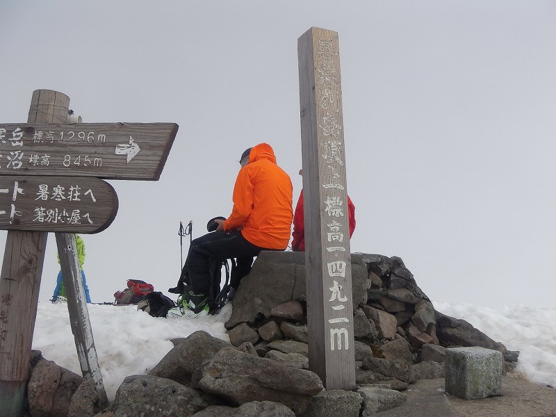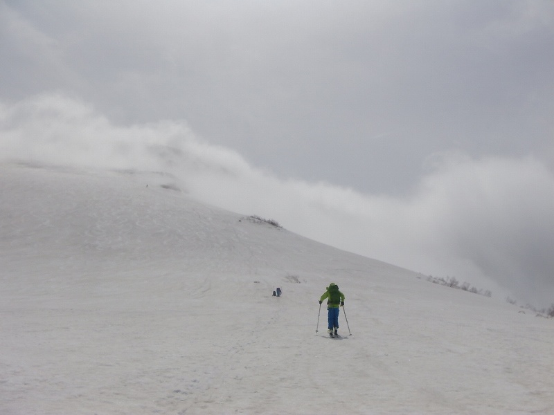 無風・快晴(前日も最高の天候だったとのこと)のもといざ出発。暑い、汗をダラダラ流しながら登って行く。滝見台まで3時間。大斜面上部はガスがかかっていてよく見えない。昨年のホワイトアウト状態が頭をよぎる。