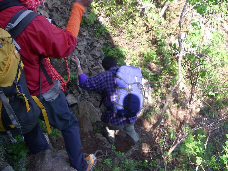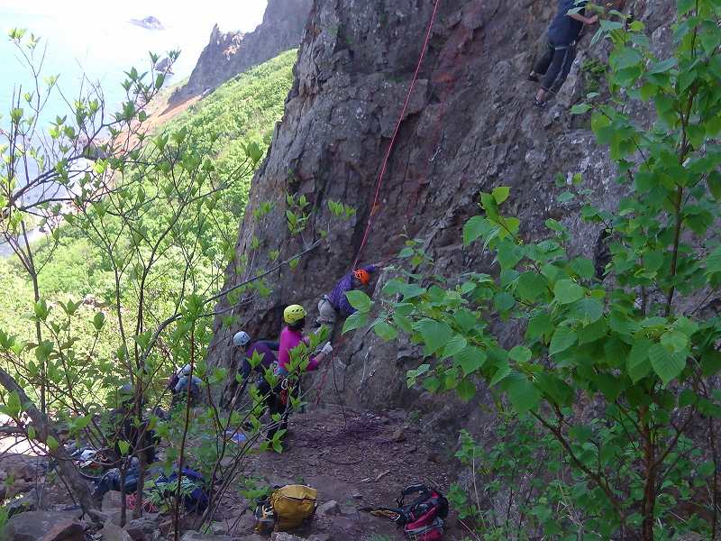 5月21日(月)小樽赤岩にて岩入門。今年は入門者1名【Y下(正)さん】、70歳になってから人生初めての岩登りである。天気は快晴、絶好のクライミング日和だが、入門者・Y下さんの少し緊張した感じが写真からも覗(うかが)える。コーチ:J子さん&S井さん、撮影:RyoMa