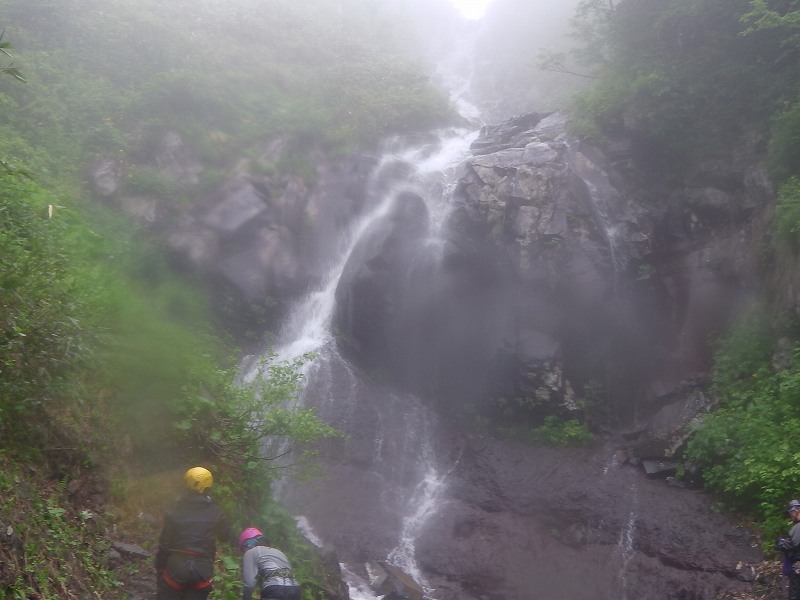 ゴルジュを何とか全員無事クリア、もう後戻りはできない。(ゴルジュを下ることはできない、先へ進み「白滝交流橋」下から86号線に上がるしかない。)幸いなことにこのころには霧雨も止んだ。いくつかの小滝をクリアし11:10「白滝交流橋」下に到着。帰りここからの登り道を確認して最終目的地『望岳の滝』へとまた遡行を開始すること40分(11:50)『望岳の滝』に着く。今日のこの状況でよくここまで頑張ったとの満足感がみんなの顔に現れていた。ガスっている遥か上から流れ落ちる滝にしばし見とれる。12:05下山開始するも、まだまだ安心できない。登りより慎重に足元に注意して下り、12:45「白滝交流橋」下に到着する。最後は梯子を登って道道86号線「白滝交流橋」上に上がりやっと安心、みんな満面の笑み~。15分ほど道道を歩いて13:10駐車地点に戻ってきた。
